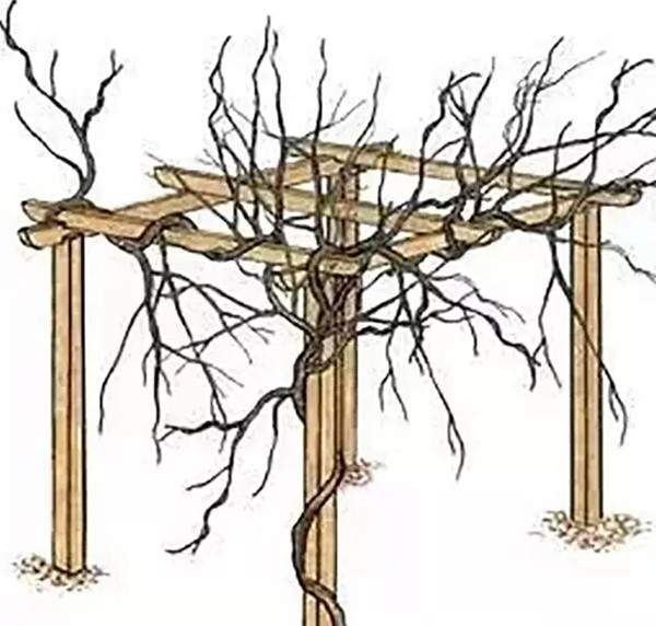 ▲紫藤骨架定型以后,應在每年冬天剪去枯死枝、病蟲枝、纏繞過分的重疊枝。一般小側枝,留2至3個芽短截,使架面枝條分布均勻。