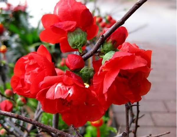 日本海棠,又名倭海棠,日本木瓜。其花與貼梗海棠極相似,只是葉稍薄。其干多叢生,多分枝,枝上有疣狀物突起,枝上有細(xì)刺。花色有大紅和粉紅色,花期3月至4月。每簇花由數(shù)朵組成,緊貼在枝上,艷麗嫵媚。花后結(jié)球形果實(shí),黃色,果徑約4厘米。可植于庭院、路邊、坡地,也常作盆栽,置陽臺(tái)、室內(nèi)觀賞。其特點(diǎn)為復(fù)色,為稀有自然變異品種。一株同時(shí)開出大紅、粉紅、純百或白色花中加以紅線、紅瓣、紅邊等;花繁,此花老枝、老干和當(dāng)年生枝均著花,且每年著數(shù)朵,盛開時(shí)繁花似錦,極為美觀,是春節(jié)觀賞的佳品;樹型優(yōu)美,此花多橫生枝,耐修剪,易于成型,是制作花卉盆景的極好樹種; 花期長 ,用簡易溫室春節(jié)前可以開花,花期2個(gè)月。露天栽培黃河流域春分前后盛開,是公園、庭院綠化的高檔花木。栽培粗放,適宜全國各地氣候和土壤。能耐低溫-32攝氏度,高溫42攝氏度。