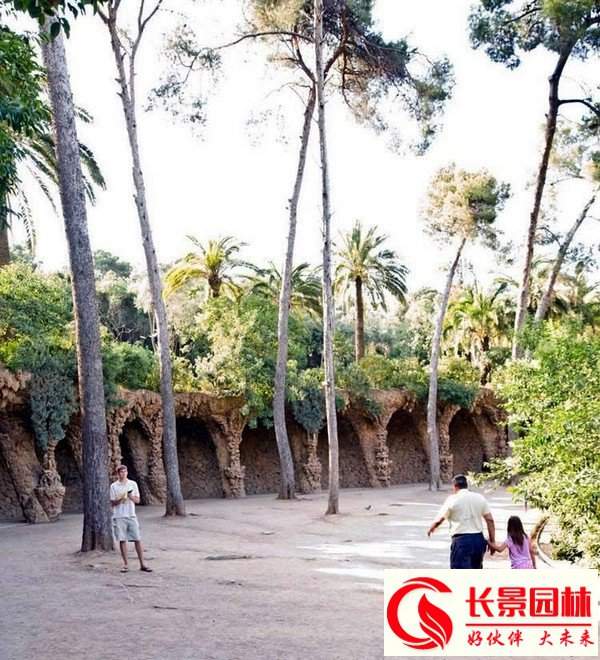 這里有堪稱是世界第一長度的座椅。長椅用石砌成,形似波浪蜿蜒曲折。表面用馬賽克碎片隨意拼貼,圖形各異且隱含寓意。長椅根據(jù)人體力學設計,靠